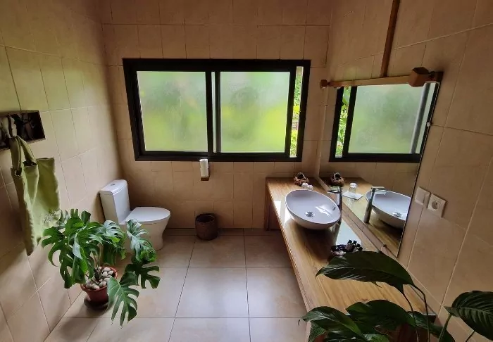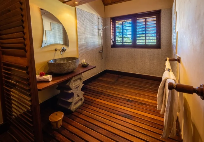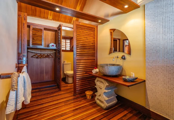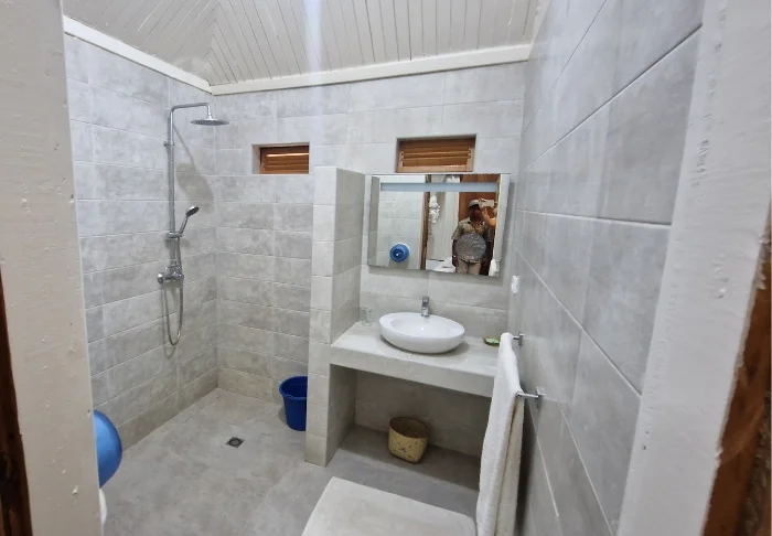 Alle bungalows zijn natuurlijk voorzien van een eigen badkamer, waarbij de douche buiten is, zodat je nooit ver van de natuur bent.