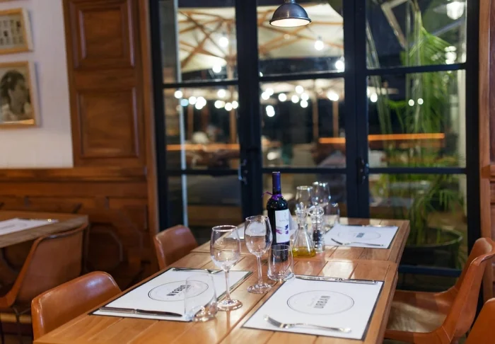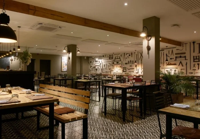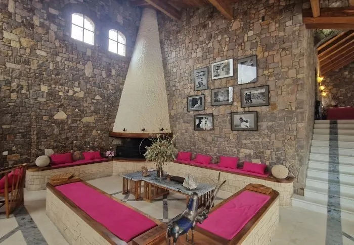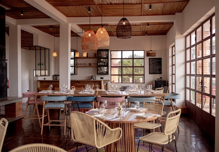 De maaltijden worden genuttigd in het restaurant, dat bijna doet denken aan de mensa van een kostschool, met lange tafels en een loungegedeelte waar je gezellig kunt zitten en genieten van een drankje voor het diner.