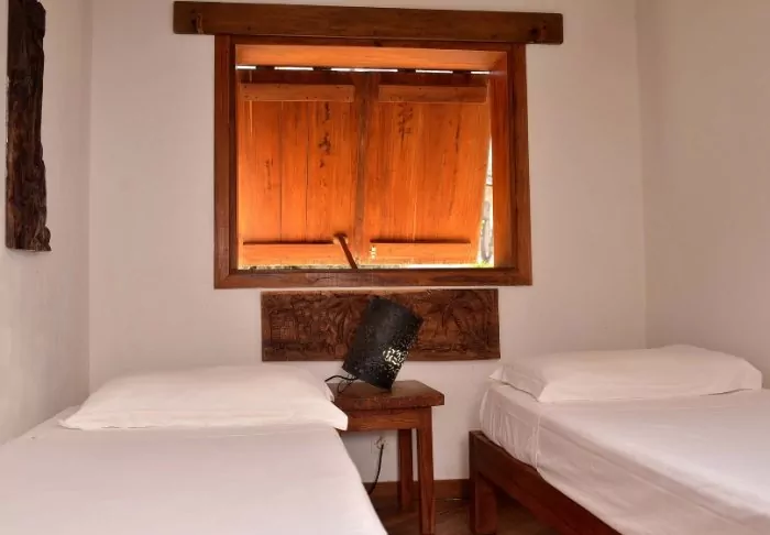 De 18 kamers van het hotel zijn relatief eenvoudig ingericht met rustieke meubels en veel bagageruimte. Natuurlijk hebben ze allemaal een eigen badkamer (zij het wat verouderd), ventilator en klamboe boven de bedden.