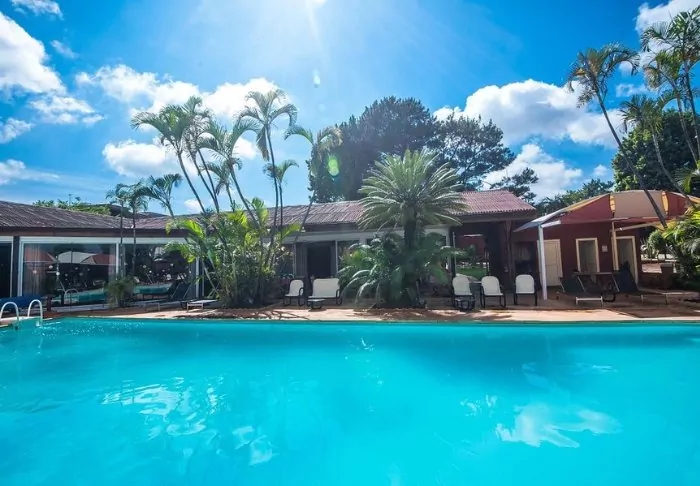 Het hotel ligt op een heuveltop en vanuit de lounge en het restaurant heb je een prachtig uitzicht op het nationale park. De kamers liggen achter het hoofdgebouw zelf, met toegang via paden door de weelderige tuin.