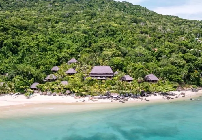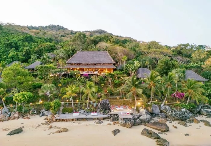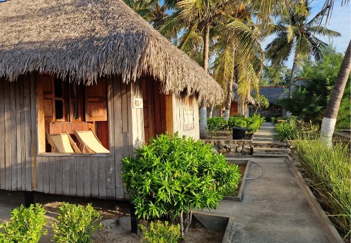 Het resort bestaat uit sfeervolle bungalows van donker hout die verspreid langs het strand liggen, omgeven door bloeiende struiken en klimplanten. Elke bungalow heeft een eigen terras met uitzicht op zee of de tuin – de ideale plek om te ontspannen met een drankje in de hand, bijna met uw voeten in het zand, terwijl de zon ondergaat.