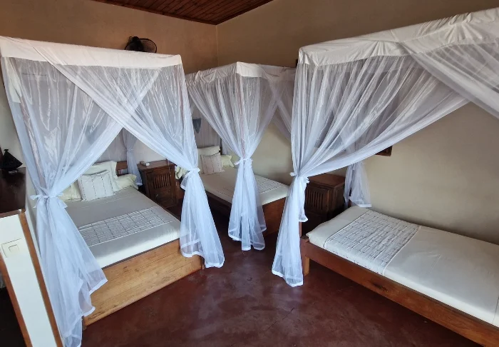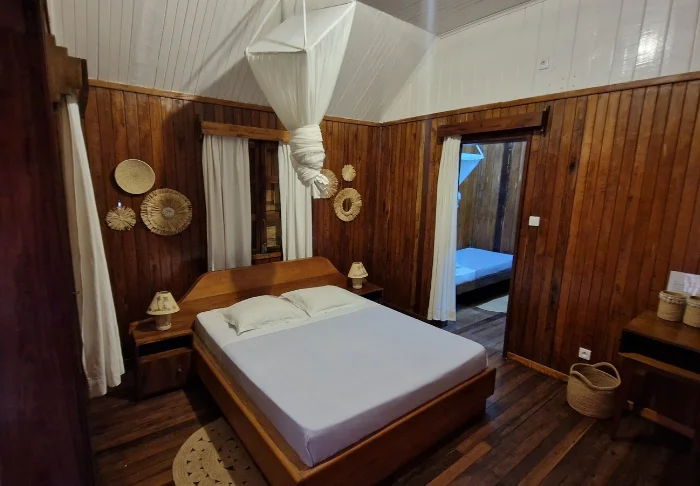 De 22 kamers zijn allemaal ingericht in traditionele Malagassische stijl – dat wil zeggen heel eenvoudig, met houten vloeren en houten meubels – en verder niet veel. Het hotel is mooi schoon, maar je moet niet veel meer verwachten dan een bed om in te slapen, lekker eten en hopelijk prima entertainment.