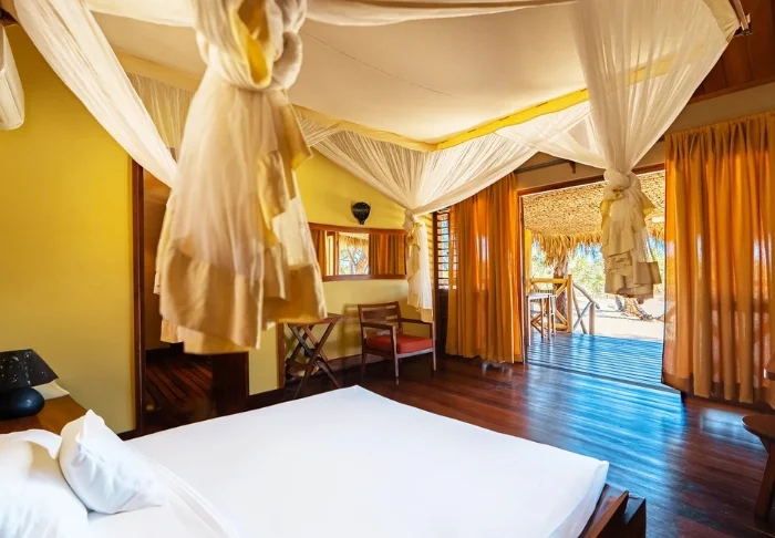 De bungalows zijn echt iets bijzonders! Er is een badkamer met een vrijstaand bad, een eigen balkon met uitzicht op een meer, thee- en koffiefaciliteiten, prachtig katoenen linnengoed, een minibar en wifi (die, zoals gebruikelijk in Madagaskar, wat onstabiel kan zijn). De bungalows hebben twee verdiepingen en bieden plaats aan zowel een bed als een kleine ontspanningsruimte. Ze zijn ingericht in gedempte neutrale kleuren.