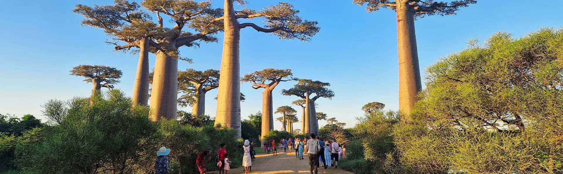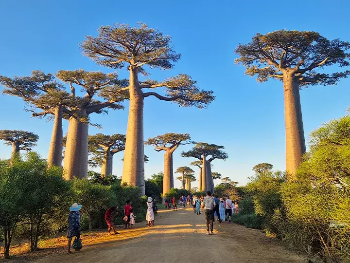 Na een onvergetelijke roadtrip door de steeds wisselende landschappen van Madagaskar, ontmoet u een ander wonder van de natuur: de imposante, eeuwenoude baobabbomen bij Morondava.