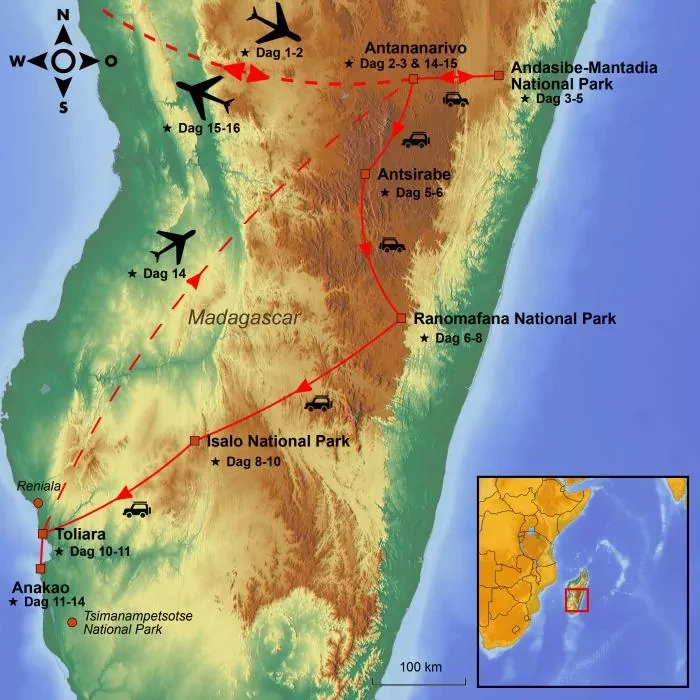 Het is tijd om afscheid te nemen van het prachtige Isalo, maar gelukkig liggen er nog meer mooie en spannende natuur- en dierenervaringen voor je in het verschiet. De koers is zuid-zuidwest, met Toliara als eindbestemming.