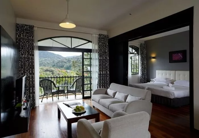 De kamers zijn groot (min. 44,6 m2) en ingericht met houten vloeren en mahoniehouten meubels, die een natuurlijke warmte toevoegen, terwijl verse orchideeën een beetje kleur geven aan de witte, zwarte en grijze tinten. De grote ramen van de kamers nodigen de natuur binnenstromen en bieden een prachtig uitzicht op de groene omgeving. Binnen vind je alles wat je nodig hebt om je thuis te voelen, van zachte bedden tot een comfortabele zithoek met een bank, een tafel en een tv. Andere voorzieningen zijn wifi, thee- en koffiefaciliteiten, gratis flessen water en een kluisje, en ook de badkamers zijn voorzien van een douche, een föhn en essentiële toiletartikelen.