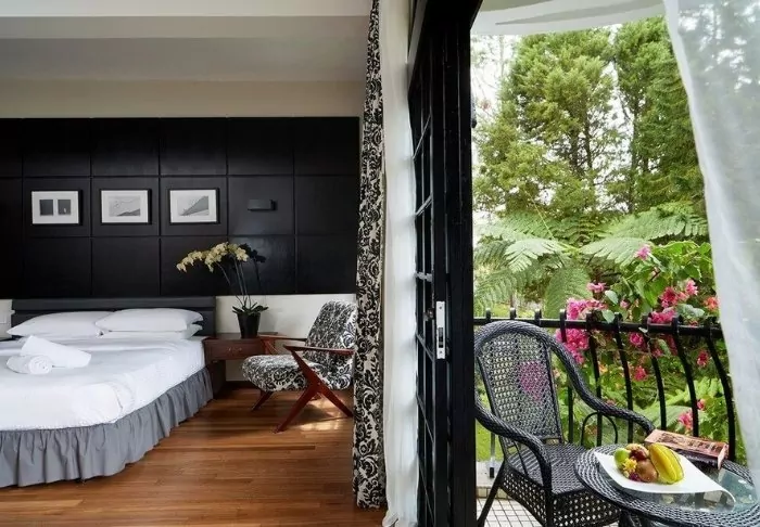 De buitenkant van het resort is in Britse koloniale stijl met witte gevels, zwarte glasramen en mooie balkons versierd met prachtige bloemen uit de omgeving.