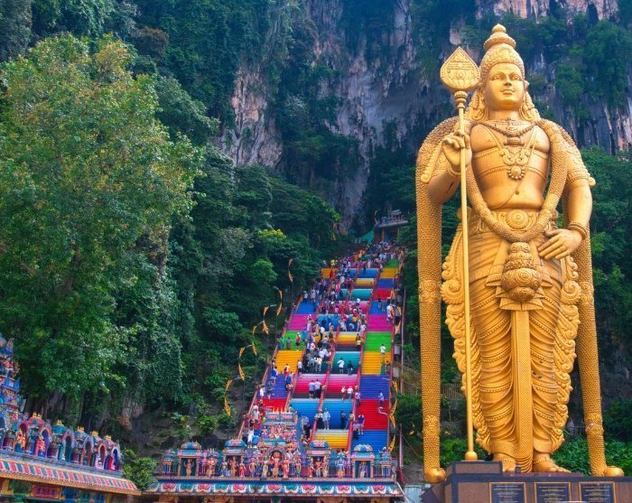 Vervolg naar KL Central Station, waar u de trein uit de stad neemt naar het hindoëheiligdom, Batu Caves. Deze locatie kenmerkt zich door talrijke grotten met tempels, religieuze beelden en levendige muurschilderingen. Het meest opvallend is het enorme gouden beeld van Heer Murugan, dat de levendige, regenboogkleurige trap van 272 treden naar de grotten bewaakt en een adembenemend uitzicht over Kuala Lumpur biedt.