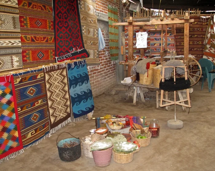 De reis vervolgt naar Teotitlan, bekend om zijn prachtige, handgeweven wollen tapijten. Hier kunt u het traditionele weefproces bekijken dat door generaties heen is doorgegeven.