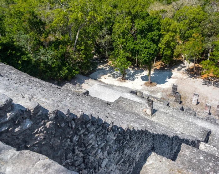Na enkele uren rijden, dwars door kleine dorpjes en dicht tropisch groen, bereikt u het Calakmul Biosfeerreservaat—een uitgestrekt beschermd natuurgebied waar apen, toekans en zelfs jaguars leven. Hier ligt de oude Mayastad Calakmul, omhuld door een zee van dichte vegetatie.
