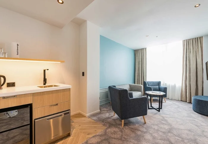 De 25 ruime units zijn licht en gastvrij ingericht en beschikken elk over een eigen badkamer en een goed uitgeruste kitchenette met een magnetron, koelkast en kookplaat – ideaal om zelf eenvoudig een maaltijd klaar te maken.