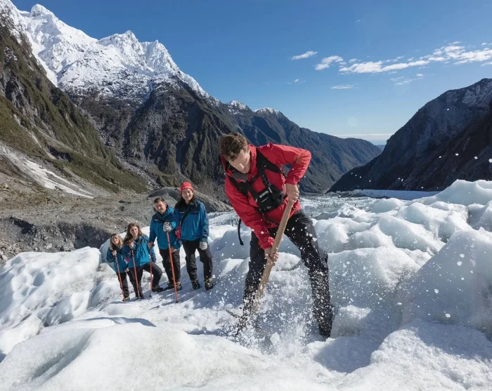 Dan is het tijd voor een werkelijk spectaculaire helikoptervlucht, waarbij u over weelderig regenwoud zweeft en uitkijkt over het felblauwe ijslandschap van de gletsjer. Geniet onderweg van prachtige uitzichten op de Zuidelijke Alpen en indrukwekkende ijsvalpartijen, voordat u landt op een veilig gedeelte van de gletsjer zelf.