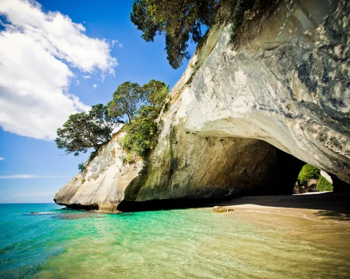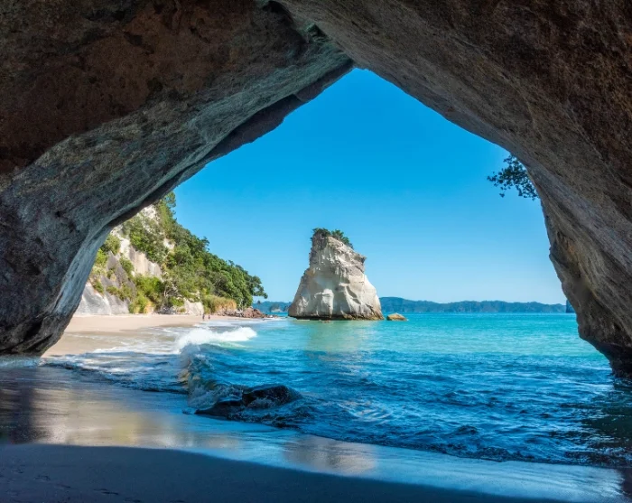 Na de lunch (voor eigen rekening) gaat de reis verder naar de beroemde rotsformatie van Cathedral Cove, een van de meest iconische natuurlijke wonderen van Nieuw-Zeeland.