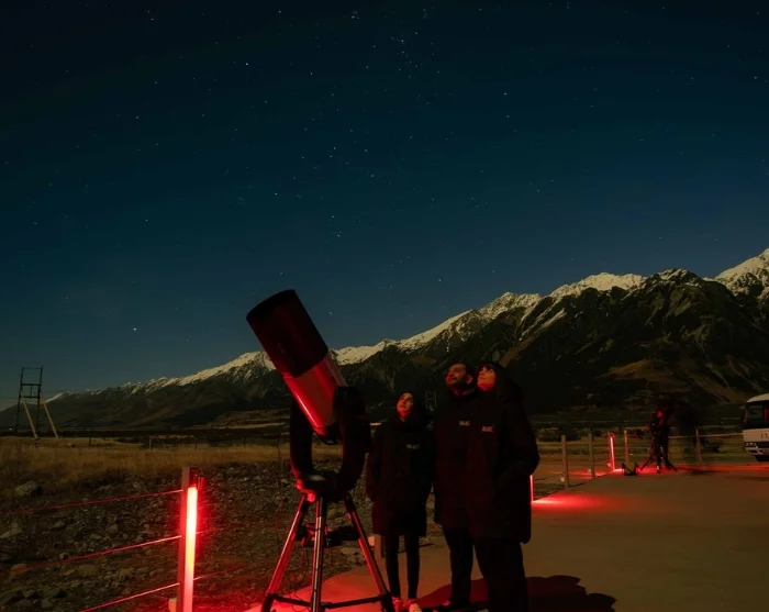 Vervolgens maakt u een korte rit naar een speciale buitenlocatie, volledig vrij van lichtvervuiling, waar u onder de overweldigende zuidelijke sterrenhemel kunt genieten. Met het blote oog, krachtige verrekijkers en geavanceerde telescopen bewondert u de Melkweg, diverse sterrenbeelden – waaronder het Zuiderkruis, dat ook op de Nieuw-Zeelandse vlag prijkt – maar ook planeten, manen en verre sterrenstelsels.
