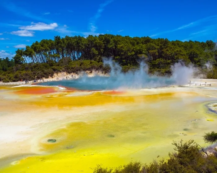 - Op nog geen 30 kilometer van Rotorua ligt Wai-O-Tapu: een kleurrijk geothermisch sprookjesland waar je je ogen uitkijkt op het surrealistische landschap vol pruttelende modderpoelen en warmwaterbronnen in de meest bonte kleuren – met als absolute blikvanger de bijna buitenaardse Champagne Pool.