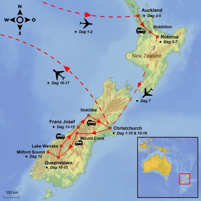 Uw reis begint in Auckland, de grootste stad van het land, waarna u het magische Hobbiton bezoekt. Vervolgens reist u door naar Rotorua: een regio vol borrelende geothermische landschappen en authentieke Maori-cultuur.
