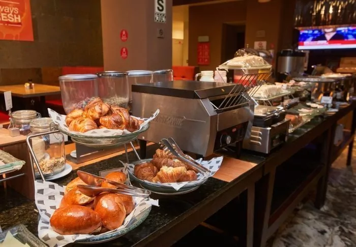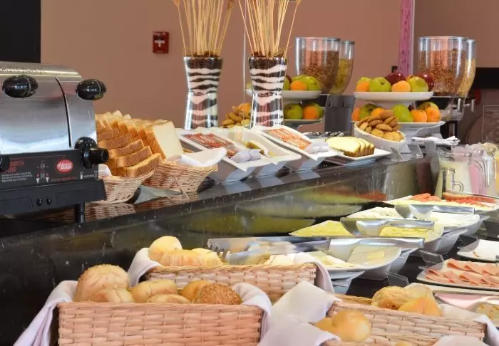 In het restaurant van het hotel kun je de dag beginnen met een ontbijt, dat is inbegrepen. Hier heb je de keuze uit ontbijtgranen, brood, kaas, ham, sap, enz.