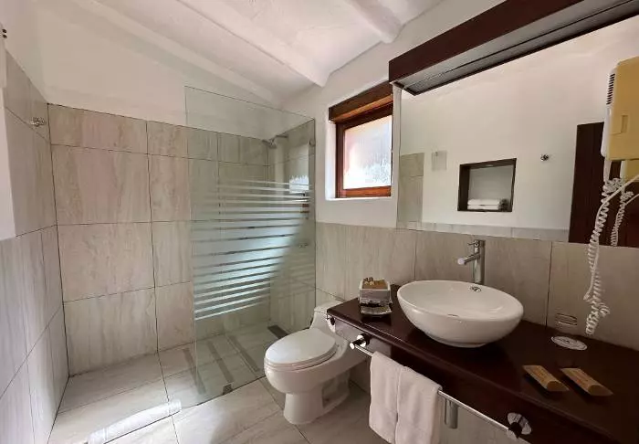 Er is een groot stuk land dat bij het hotel hoort en ze hebben hun eigen café, restaurant, distilleerderij en een grote tuin met exotische bloemen en fruitbomen, die onder andere kolibries aantrekken. Op het aangrenzende perceel runnen ze een biologische boerderij die nog steeds traditionele technieken gebruikt die al eeuwenlang bestaan. Als gast die in het hotel verblijft, kun je de boerderij bezoeken en een interessant inzicht krijgen in de productie ervan.