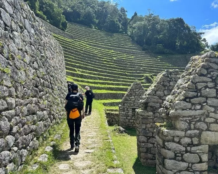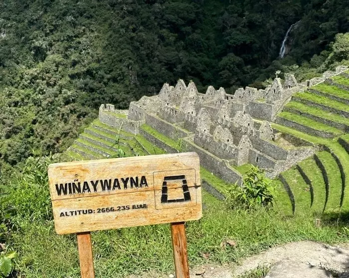 Je bereikt de derde pas op een hoogte van ongeveer 3.600 meter, in de buurt van de goed bewaard gebleven Inca-stad Phuyupatamarca, waarvan de Quechua-naam “De stad boven de wolken” betekent, vanwege de hoge locatie. Je kunt hier even pauzeren en genieten van je lunch met uitzicht op de heilige Inca Urubamba-vallei. De lange afdaling begint dan bij Wiñay Wayna, het grootste complex in het gebied na Machu Picchu en Llactapata. De ruïnes bevinden zich aan één kant van de berg en bestaan uit huizen, torens en terrassen. Het complex heeft een indrukwekkende, schilderachtige locatie direct achter je kamp.
