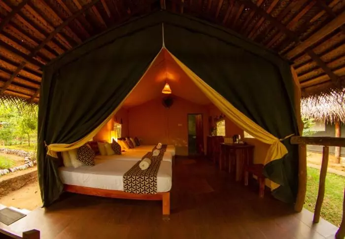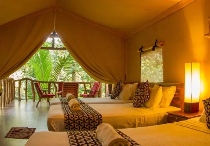 Het kamp bestaat uit luxe tenten die gekenmerkt worden door avontuur en ontspanning. Ze staan midden in de prachtige natuur. U wordt dus wakker met het geluid van fluitende vogels en het rustgevende stroompje van de rivier. De tenten zijn voorzien van echte bedden en een eigen badkamer met zowel koud als warm water. In uw tent vindt u ook gratis flessen mineraalwater en een waterkoker, zodat u zelf een kopje thee of koffie kunt zetten dat u op uw veranda kunt opdrinken. Een klamboe en föhn kunnen worden geleend bij de receptie en er is gratis wifi in de gemeenschappelijke ruimtes.