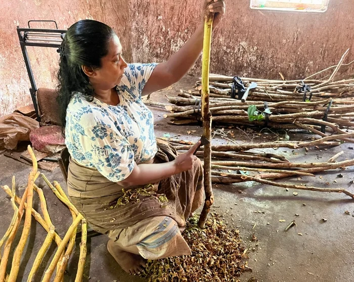 Onderweg stop je in het dorpje Ahangama voor een gezellige en levendige rit met de tuktuk door het weelderige landschap. Hier bezoek je lokale families die zich bezighouden met twee van de oudste ambachten in de regio: het verwerken van kaneel en het vlechten van mooie huishoudelijke gebruiksvoorwerpen van suikerriet. Je ziet met eigen ogen hoe geurige kaneeltakken worden omgetoverd tot de bekende stokjes, terwijl het suikerriet wordt gevlochten tot prachtige en praktische objecten. Het bezoek wordt afgesloten met een dampende kop thee en een proeverij van lokale zoete lekkernijen, met uitzicht op de prachtige Koggala-lagune.