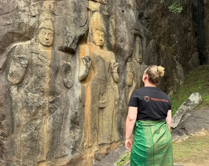 Onderweg stopt u bij de Buduruwagala-tempel, die stamt uit de 10e eeuw en bekendstaat om zijn indrukwekkend goed bewaard gebleven rotssculpturen. De tempel ligt tegen een enorme rotswand, waarop een 16 meter hoog Boeddhabeeld prijkt, omringd door zes kleinere figuren die de Boeddha in verschillende mediterende houdingen tonen. U krijgt ruim de tijd om in alle rust de verfijnde details en serene gezichtsuitdrukkingen te bewonderen, want Buduruwagala is een vredig heiligdom – een oase van rust vergeleken met de drukkere tempels van Sri Lanka.