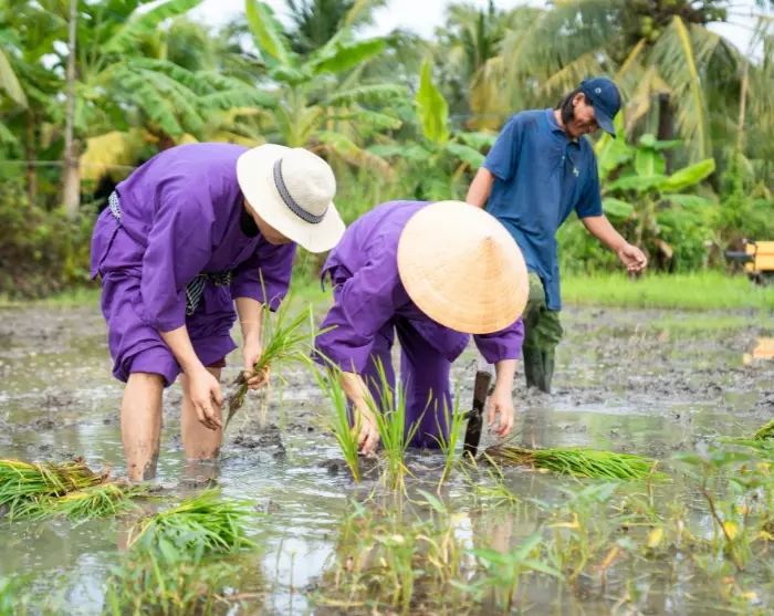 Te midden van het weelderige landschap van de Mekongdelta, waar kronkelende rivieren en kanalen tussen uitgestrekte rijstvelden en boomgaarden stromen, ligt Vinh Long. Hier krijgt u de kans om ons duurzaamheidsproject te bezoeken, dat we samen met onze lokale partner in Vietnam zijn gestart. Als u met ons reist, steunt u direct dit waardevolle initiatief.