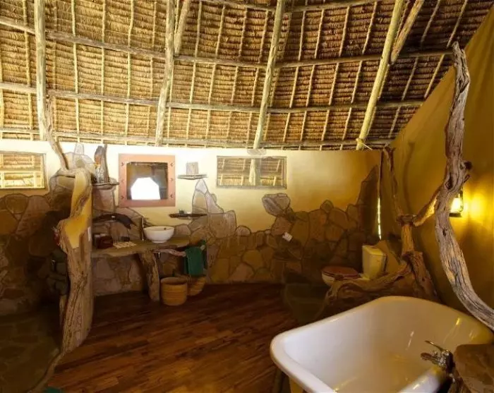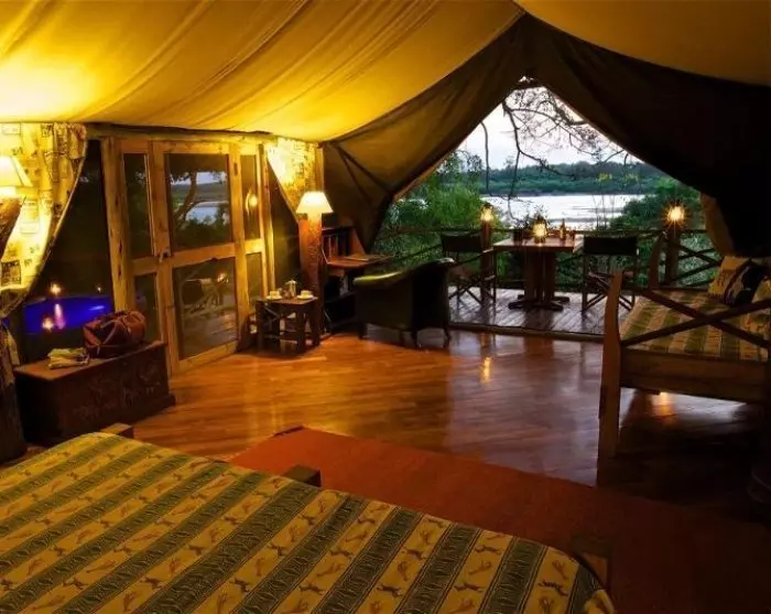 Elf tenten staan naast elkaar aan de oevers van de grootste rivier van Tanzania, de Rufiji. Ze zijn allemaal gebouwd op platforms en hebben grote veranda’s, natuurlijk met uitzicht op de rivier. De vloeren zijn gemaakt van massief hout en de wanden zijn een combinatie van canvas en schuifdeuren. De bedden zijn comfortabel en er is voldoende ruimte voor bagage. Alle materialen zijn lokaal – en het kamp is gebouwd door lokale vakmensen, zodat de arbeid en het inkomen in de omgeving blijven. Er is warm stromend water in de badkamer, maar dat wordt verwarmd door de zon, dus de watertemperatuur kan licht variëren.