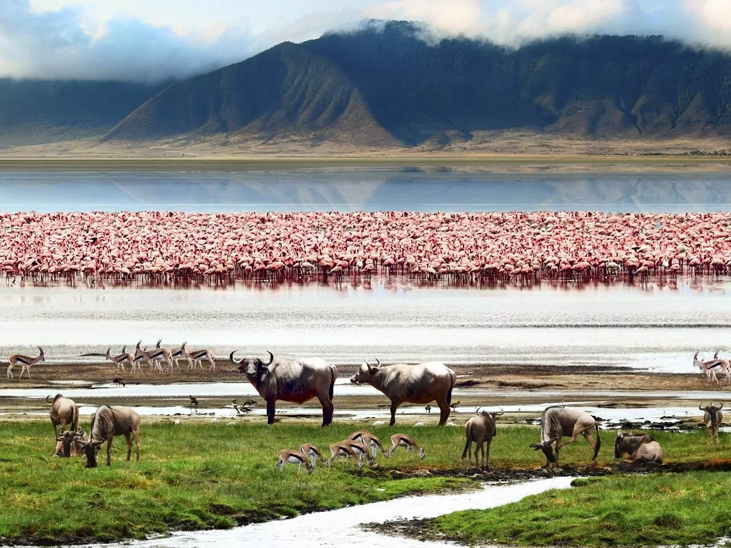 Vanaf de kraterrand kronkelt de weg 600 meter naar beneden aan de binnenkant van de gedoofde vulkaankrater tot aan de 260 km² grote kraterbodem. In de weelderige krater ziet u savanne, moerassen, meren, kleine riviertjes, acaciabossen en een zoutwatermeer. Er leven tussen de 25.000 en 30.000 dieren in de krater. De ervaring op de bodem van deze krater wordt vaak vergeleken met “een rit door Jurassic Park”, omdat er overal dieren zijn. Er zijn in dit relatief kleine gebied meerdere groepen leeuwen, grote kuddes buffels, flamingo’s, ja zelfs de zwarte neushoorn heeft zijn weg naar de krater gevonden. Het enige dier dat u hier niet zult zien is de giraffe, dit dier is nooit vanuit de Serengeti naar de Ngorongoro-krater getrokken.