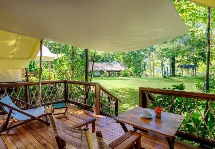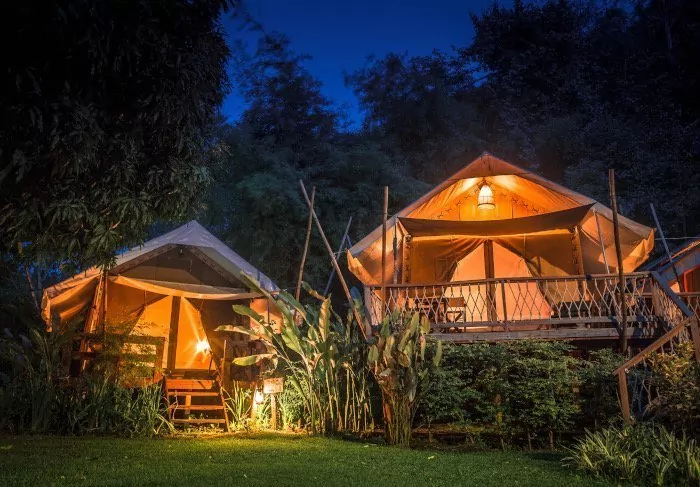 Het camp bestaat uit 38 luxe canvas tenten van tussen de 26 en 32 m², die een halve meter boven de grond staan. Ze hebben allemaal echte bedden, een eigen badkamer met warm water, een föhn en toiletartikelen, en een eigen veranda vanwaar u kunt genieten van de stilte en de weelderige omgeving. Alle tenten hebben ook wifi, airconditioning, make-up tafel/bureau, gratis flesjes mineraalwater, koelkast en waterkoker voor thee en koffie. Na 22.00 uur dient het stil te zijn in het camp – dus geen luide muziek, alleen de geluiden van de jungle.