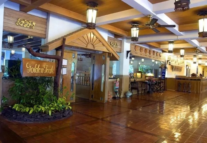 Het restaurant, Golden Teak, heeft een goede selectie Noord-Thaise specialiteiten en internationale gerechten, waar je zowel binnen als buiten van kunt genieten, perfect voor een avond in een prachtige omgeving.