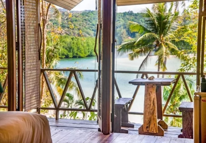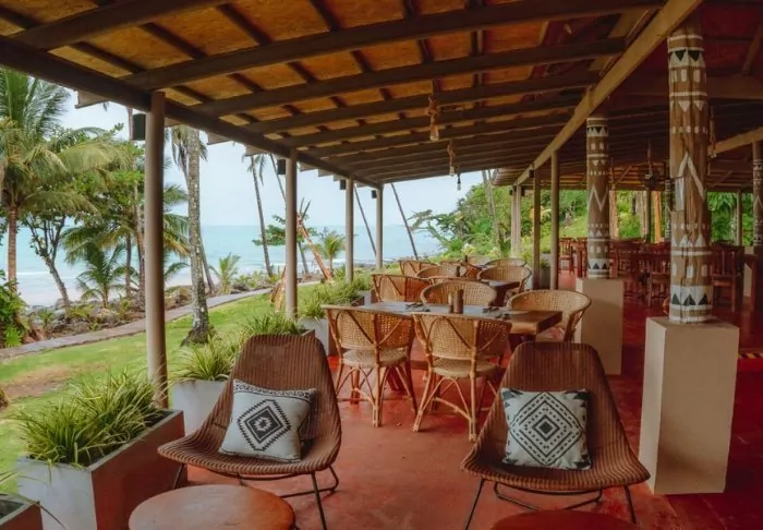 Het resort is gebouwd in prachtige pastelkleuren die goed passen in de schilderachtige omgeving met de zee aan de voorkant en het regenwoud erachter. Je voelt een ontspannen vakantiesfeer met de geluiden van rustig golven en tsjilpende vogels, wat bijdraagt aan een rustige en charmante hotelomgeving.