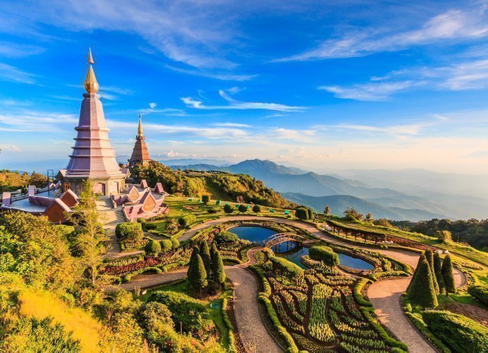 Het volgende bezoek is de mooie, goed onderhouden tuin van de berg, waar twee grote pagodes met gouden spitsen naar de hemel reiken. Deze zijn neergezet ter nagedachtenis aan koning Bhumibol Adulyadej (Rama IX) en zijn vrouw. Het uitzicht hier is werkelijk prachtig op heldere dagen en de altijd groene bossen liggen als dekens over de glooiende bergen.