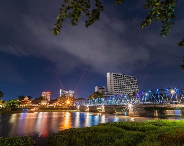 De excursie gaat nu verder in een songthaew, een omgebouwde pick-up, naar een lokale bloemenmarkt, waar u kunt rondwandelen tussen de vele kraampjes vol kleurrijke bloemen en lokale lekkernijen. Hier steekt u de Ping-rivier over en kunt u genieten van het uitzicht op Wat Gate Garam in het avondlicht.