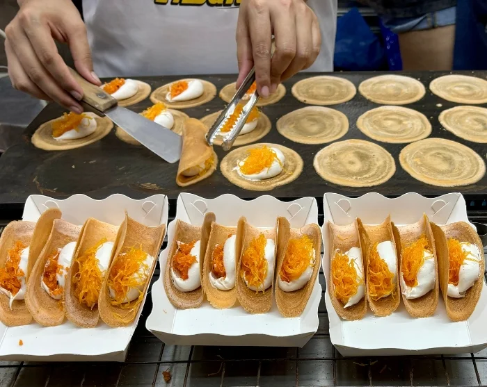 De volgende stop is een lokale nachtmarkt, waar u de tijd heeft om langs de vele kraampjes te struinen. U leert meer over lokale delicatessen, bijv., gebraden varkenspoot (khao kha mu), kokospudding en kleefrijst met eieren (bua loi khai waan).