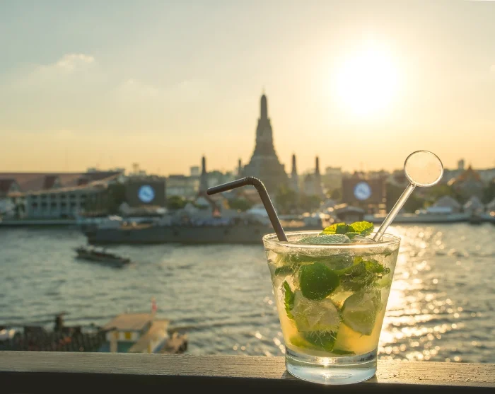 De avond wordt afgesloten op een ontspannen rooftop bar met uitzicht op de Chao Phraya rivier en de verlichte Wat Arun tempel. Het uitzicht kan niet mooier!
