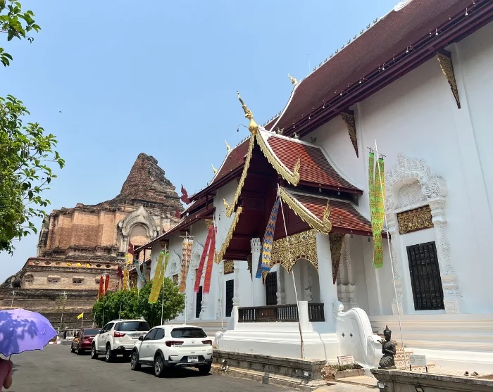 Je wordt naar het kantoor van onze partner gebracht, waar je een fiets en helm ontvangt. Na een korte uitleg is het tijd om op de pedalen te gaan staan en de charme van de stad te absorberen. De route is eenvoudig en vlak, geschikt voor de meeste mensen. Je fietst door de kleine en rustige straatjes van Chiang Mai naar het charmante Wat Inthakhin Sadue Mueang, bekend om zijn 700 jaar oude witte Boeddhabeeld. De fietstocht gaat verder langs het Three Kings Monument naar de stadspoort, Tha Phae Gate, waar vroeger handelaren goederen de stad binnenbrachten. Hier vertelt de gids je meer over de historische rol van Chiang Mai als handelscentrum. Vervolgens ga je naar de nabijgelegen Somphet markt, waar je de tijd hebt om rond te dwalen en de lokale sfeer op te snuiven. Ook krijg je de kans om de kleurrijke vruchten en zoete lekkernijen te proeven. Daarna bezoek je Wat Chiang Man, de oudste tempel van Chiang Mai. Het herbergt de 1800 jaar oude kristallen Boeddha en de 2500 jaar oude marmeren Boeddha. Tot slot bezoek je het grootste en meest iconische monument van de stad, Wat Chedi Luang, dat ooit de Smaragdgroene Boeddha huisvestte en nu veilig bewaard wordt in de Wat Phra Kaew-tempel in Bangkok.