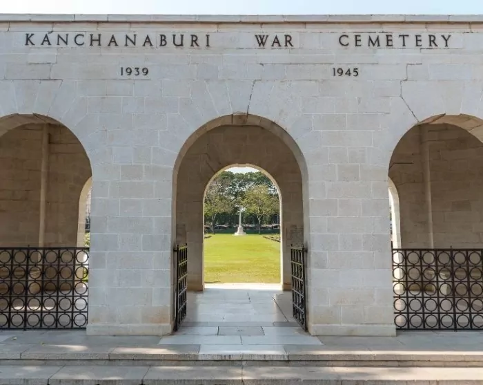 Je gaat verder naar de Kanchanaburi War Cemetery, een gedenkplaats voor meer dan 6000 geallieerde krijgsgevangenen die stierven tijdens de aanleg van de spoorweg en die na de oorlog naar deze laatste rustplaats werden overgebracht.