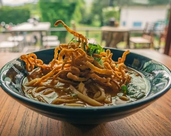 Na een mooie fietstocht van 3-4 uur wacht een welverdiende en heerlijke lunch, die bestaat uit het gerecht “khao soi” – een pittige noedelsoep, een bijzondere specialiteit in het noorden van Thailand. De lunch wordt geserveerd in restaurant Naree De Klang Vieng, dat wordt gerund door gevangenen uit de vrouwengevangenis van Klang Vieng. Dankzij dit uitstekende rehabilitatieproject krijgen de vrouwen, die meestal veroordeeld zijn voor de handel of productie van drugs, de kans zich te scholen in verschillende dienstverlenende vakken en dit bereid hen voor op een nieuw leven buiten de gevangenismuren. Het eten en de service zijn top!