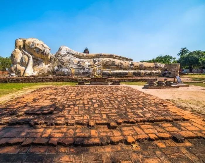 Het laatste bezoek is aan het oude klooster Wat Lokaya Sutha. Er is niet veel van over, behalve de overblijfselen van de oude muren, vloeren en zuilen. De grote attractie is de 37 meter lange liggende Boeddha met een vredige glimlach.