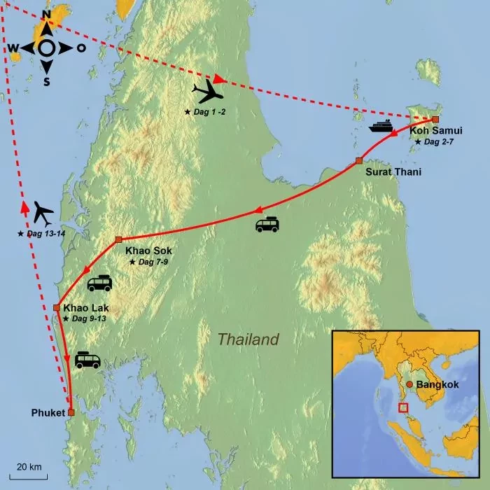 De reis begint op het op een na grootste eiland van Thailand, Koh Samui. U kunt zich verheugen op een interessante rondleiding over het eiland, waar u Big Buddha, de rotsformaties Hin Yai en Hin Ta en een van de beroemdste watervallen van het eiland ziet. De overige dagen op Koh Samui zijn zonder geplande activiteiten en u bepaalt zelf of u wilt relaxen of boeiende natuurbelevenissen wilt opdoen, bijv. in het Ang Thong Marine National Park of het duikparadijs Koh Tao.