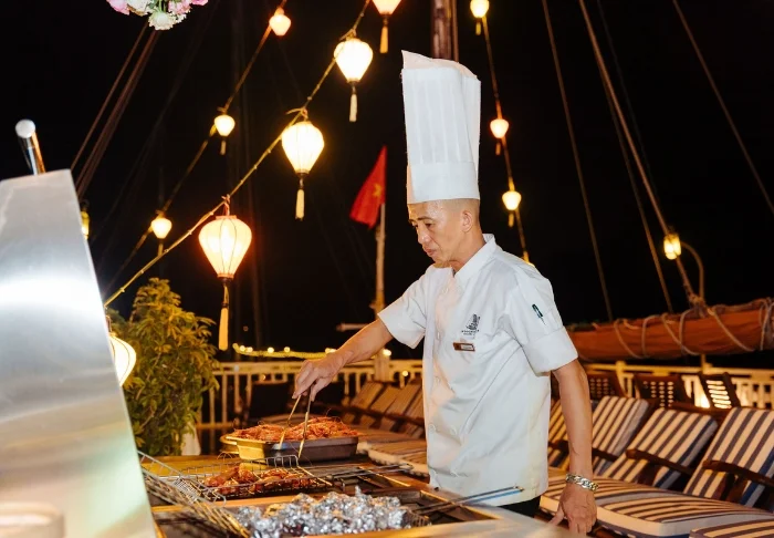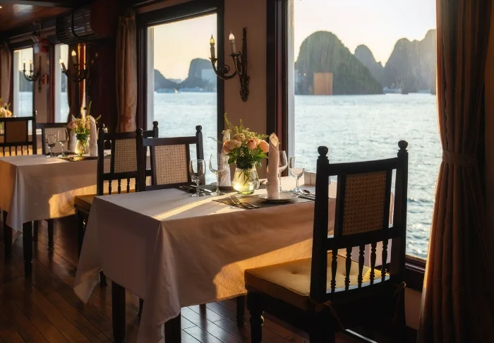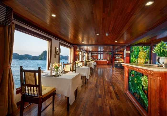 In het restaurant geniet u van een gevarieerd aanbod aan zowel Vietnamese als internationale gerechten, altijd bereid met hoogwaardige ingrediënten. De sfeer is stijlvol en dineren op het dek, terwijl de zon ondergaat, zal ongetwijfeld tot de hoogtepunten van uw reis behoren.