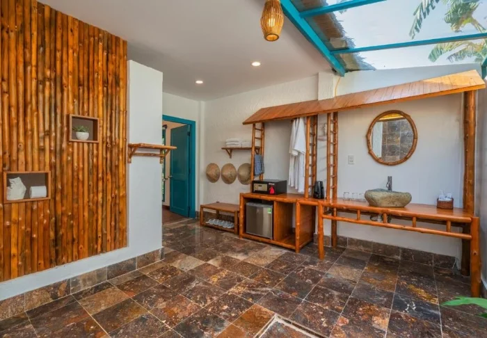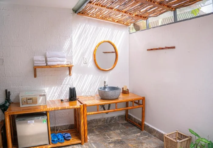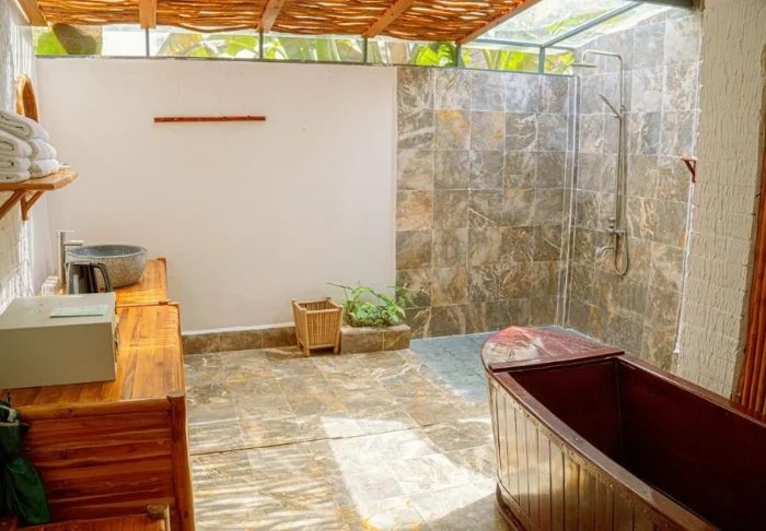 De lodge beschikt over sfeervolle bungalows die zijn gebouwd met natuurlijke materialen en perfect opgaan in de serene omgeving. U verblijft in een deluxe kamer te midden van de weelderige tuinen van de lodge, vol bloeiende planten en fruitbomen. De kamer is ongeveer 40 m² groot en ingericht met handgemaakte meubels van natuurlijke materialen, waardoor een rustige en authentieke sfeer ontstaat. U heeft de keuze uit een tweepersoonsbed of twee eenpersoonsbedden, airconditioning, een minibar, wifi en een waterkoker voor een kopje thee of koffie. De ruime badkamer is voorzien van moderne gemakken en heeft een binnen- of buitendouche. Vanaf uw eigen terras geniet u van het uitzicht op de rustgevende tuin en de ontspannen sfeer.