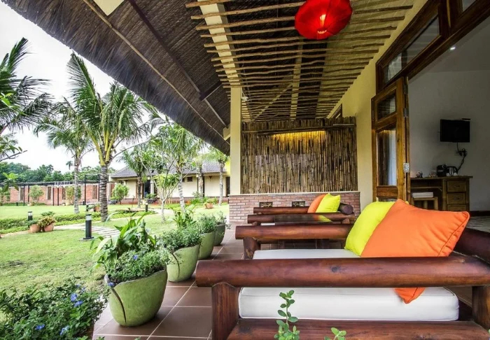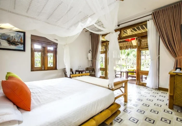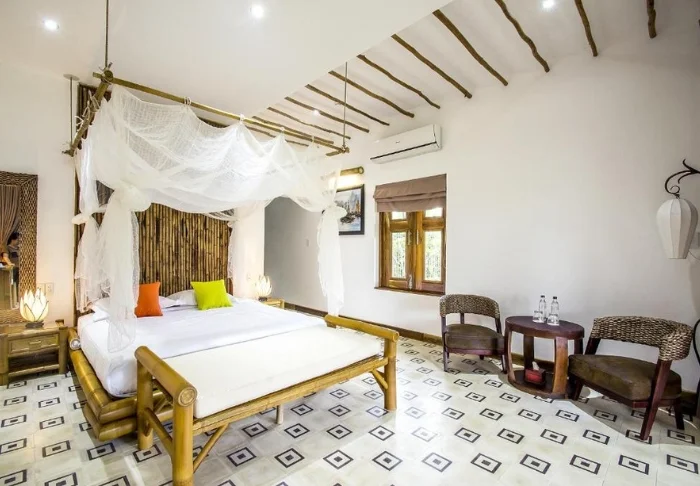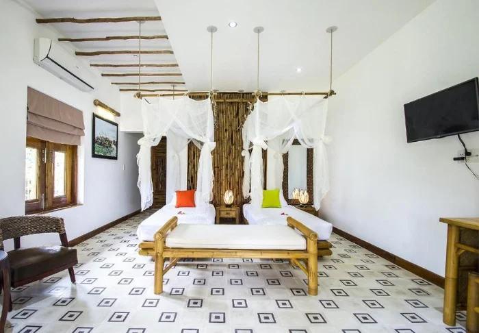 De Garden View kamers bevinden zich in knusse paviljoens, genesteld tussen de kleurrijke tuinen. Ze zijn licht, ingericht met bamboemeubels, muskietennetten over de bedden, en vrolijke kussens die zorgen voor een warme en uitnodigende sfeer. Dankzij de grote ramen haalt u het buitengevoel naar binnen en vanaf uw eigen terras geniet u van de rust en het uitzicht op de groene omgeving.