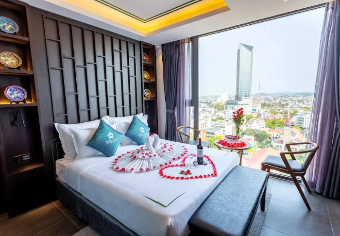 De kamers zijn stijlvol ingericht in Vietnamese stijl met donkere houten accenten. U verblijft standaard in een Superior Mountain View kamer, waar grote ramen u een schilderachtig uitzicht bieden over de stad en de weelderige heuvels op de achtergrond. Tot de kamerfaciliteiten behoren onder andere airconditioning, wifi, een waterkoker voor thee en koffie, en een TV. De badkamer is modern ingericht met een aparte douche en toilet.