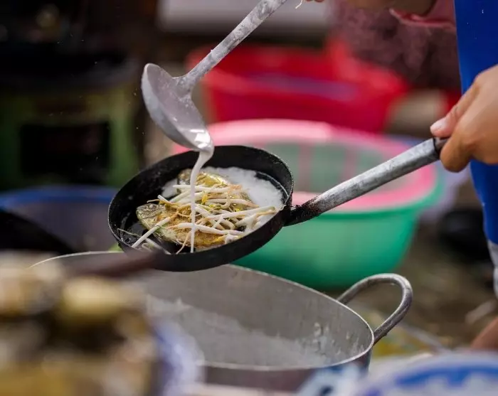 Terug op de fietsriksja word je door smalle kronkelende straatjes binnen de muren van de citadel gebracht, waar de volgende eetgelegenheid op je wacht. Hier kun je kijken hoe de chef-kok je banh khoai bereidt, Hué’s versie van een pannenkoek. Voel je vrij om hem zelf te garneren met verse kruiden voor een heerlijke gastronomische ervaring.
