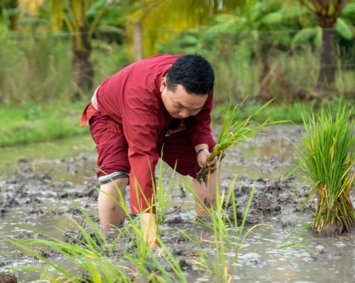 Daarna brengt uw reis u naar ons sociaal duurzaamheidsproject in Vinh Long, opgezet door onze lokale partner. U maakt een ontspannen wandeling door het dorp, waarbij uw gids onderweg meer vertelt over het project. U krijgt bovendien de kans om het traditionele plattelandsleven van dichtbij te ervaren. Samen met lokale boeren gaat u aan de slag op de rijstvelden—afhankelijk van het seizoen helpt u mee met het planten van jonge stekjes of juist met de oogst. Deze praktische en verrijkende activiteit biedt een uniek inkijkje in het dagelijkse leven op het Vietnamese platteland én in de toewijding waarmee duurzame landbouw wordt bedreven. Uw deelname aan deze reis ondersteunt bovendien families in Vinh Long, want een deel van de reissom gaat direct naar het project. Meer informatie hierover vindt u hier.