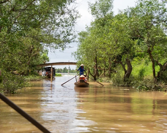 Niet lang nadat u Ho Chi Minhstad heeft verlaten, merkt u dat het landschap begint te veranderen. Onderweg passeert u uitgestrekte groene rijstvelden en slingert u langs kleine riviertjes en kanalen die door het vlakke land kronkelen. U ziet vaak lokale boeren hun gewassen verzorgen terwijl waterbuffels langs de weg grazen, en kleine stalletjes aan de kant van de weg waar u wordt verleid met vers fruit.