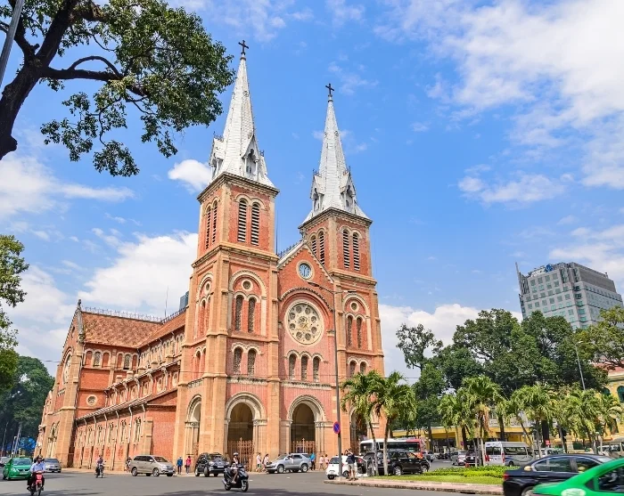 Recht tegenover het postkantoor staat de iconische Notre Dame Kathedraal, gebouwd tussen 1863 en 1880. Deze kathedraal is een indrukwekkende herinnering aan het Franse koloniale tijdperk, vooral door de karakteristieke rode baksteen en de imposante torens.