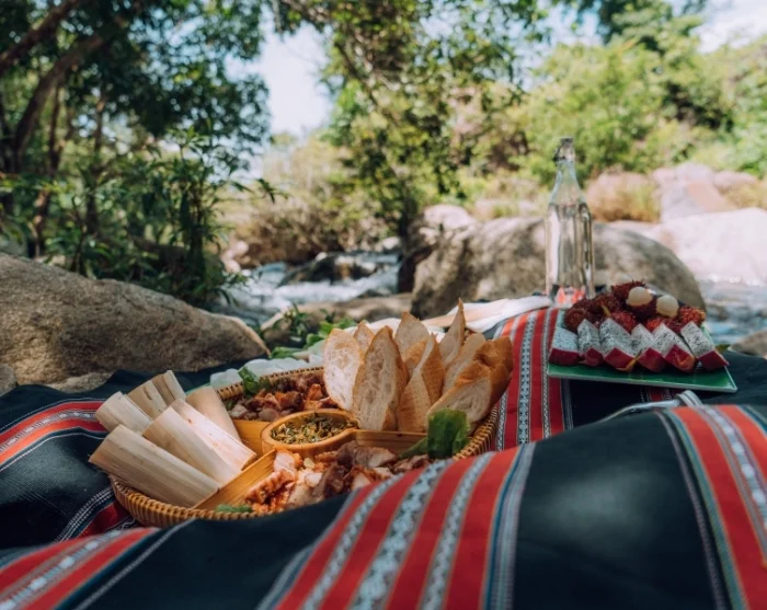 Daarna maakt u een avontuurlijke wandeling naar de Bim Bip-waterval en bewondert u onderweg het indrukwekkende landschap. Eenmaal aangekomen wacht er een picknicklunch met traditionele, in bananenbladeren verpakte gerechten – en als u zin heeft, kunt u een verfrissende duik nemen in het natuurlijke zwembad bij de waterval.